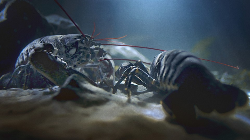 I det grunda vattnet nära stranden håller en hummer på att bygga ett sommarhus. Men en annan hummer kommer och försöker flytta in i sommarhuset. De två humrarna slåss mot varandra med sina stora klor.
