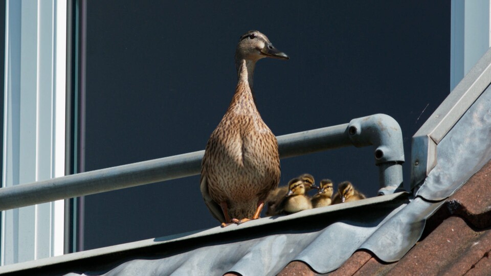 I en balkonglåda högst upp på fjärde våningen har en andmamma fött andungar. Andungarna är nykläckta men det börjar redan bli dags att lämna boet. De ska nämligen ta sig till en damm för att hitta mat. Men först måste de hoppa ända uppifrån fjärde våningen ner till marken. Tur nog är de små andungarna duktiga på att hoppa från hög höjd.