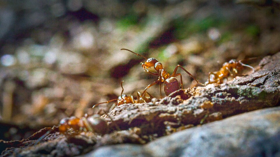 En stor tordyvel är på väg rakt mot en myrstack. Myrorna varnar varandra och attackerar. En tordyvel kan bli utsökt myrmat om myrorna kan vinna över den stora insekten.