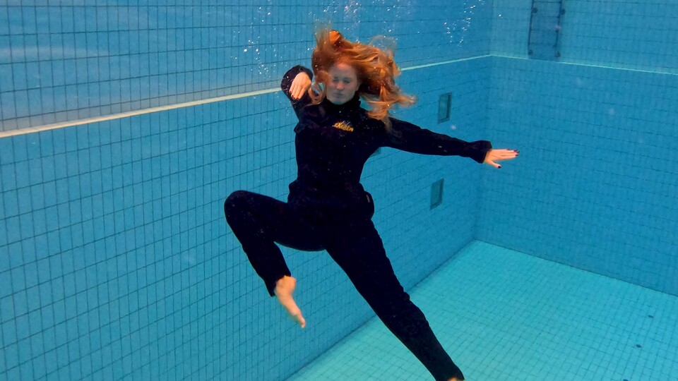 Om vattenytan är talet noll, då är allt under vattenytan negativa tal. Josefine tar sig högre och högre upp för att komma djupare och djupare.