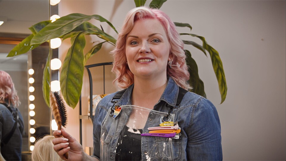 Vi är på frisersalongen där frisören Maria jobbar med att göra människor fina i håret. Det tvättas, flätas, färgas, klipps och fönas. En flicka vill ha rosa hår - det blir så snyggt!