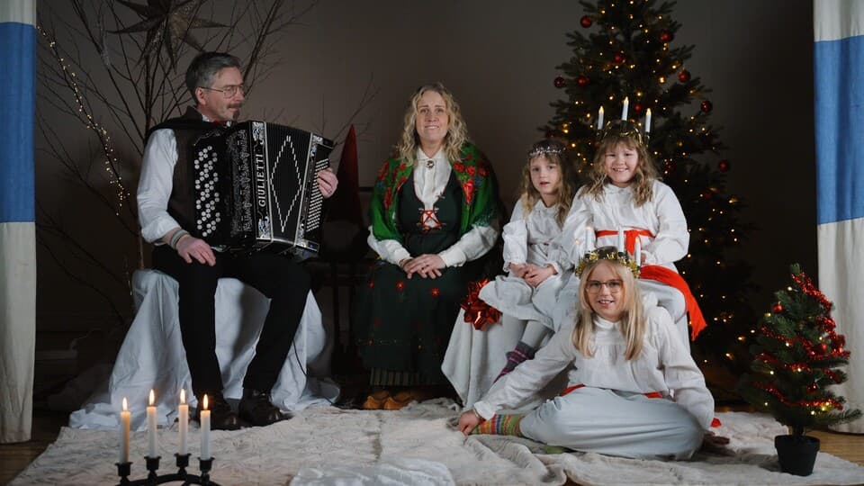 Nu är det dags för tärnor, tomtar, pepparkaksgubbar och lucia förstås! Vi sjunger "Pimeä rankka vyö" – "Luciasången" tillsammans.