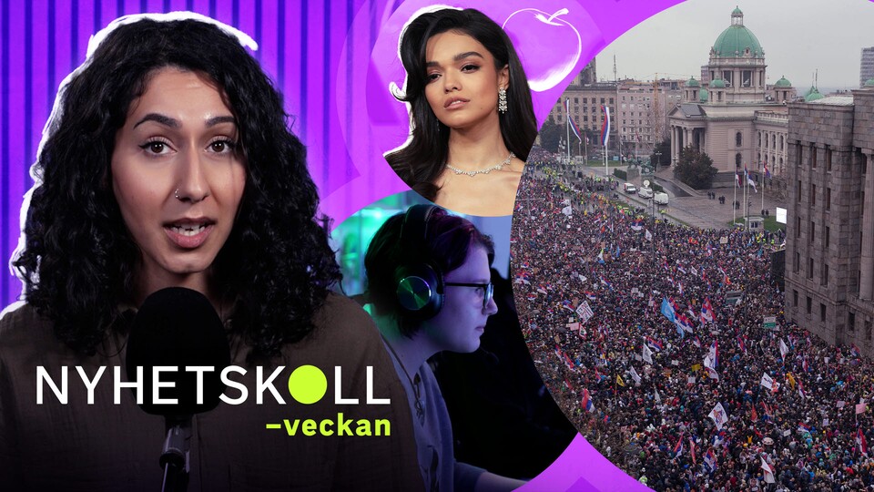 Radikalisering i gejmingvärlden, protester i Serbien och skillnader mellan det svenska och amerikanska rättssystemet är tre av veckans teman. Vi träffar gejmare som berättar om våldet de möter online och pratar pengar med unga i Skåne. Men också ett nyhetssvep med några av veckans viktigaste händelser. Dessutom utmanar vi SVT:s sportreporter i ett quiz.